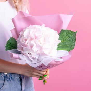 Монобукет из гортензии - это произведение искусства. Широкая палитра оттенков одного лишь розового и яркий контраст в виде насыщенно-зеленой листвы. Несмотря на свое однообразие, композиция выглядит весьма нежно и изысканно, словно её вот-вот собрали в райском саду.