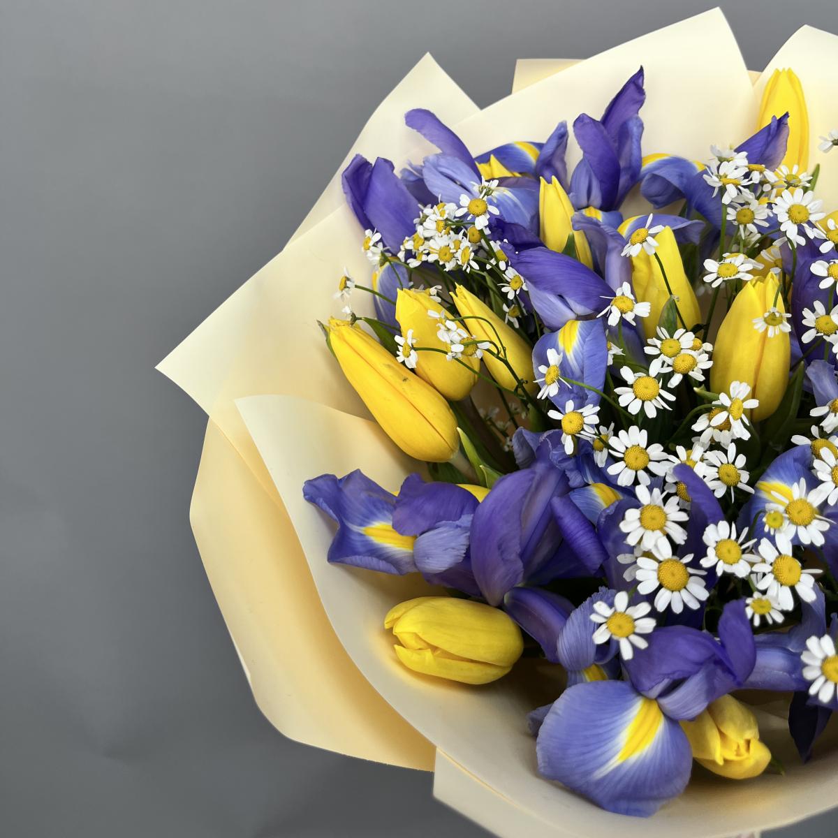 Нежное сочетание весенних цветов создаёт атмосферу радости и свежести. Яркие тюльпаны, утончённые ирисы и душистая матрикария поднимают настроение и становятся прекрасным подарком для любого повода.